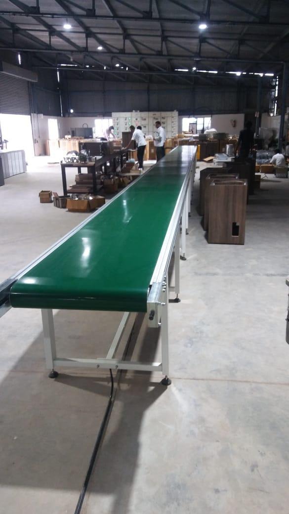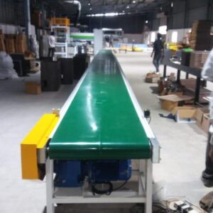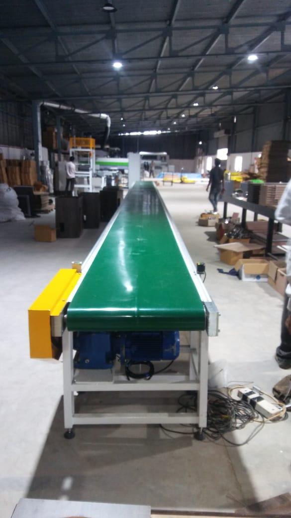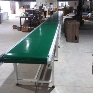 • Motorized flat belt conveyor designed for production line material handling applications. The conveyor is fabricated with a rigid MS structural frame and equipped with a PVC conveyor belt. The system is driven by a geared motor to ensure efficient power transmission and smooth belt movement. Integrated sensors are provided for automatic product detection and controlled stopping. Conveyor speed is regulated through a Variable Frequency Drive (VFD) to enable adjustable speed control and smooth operation.